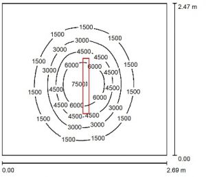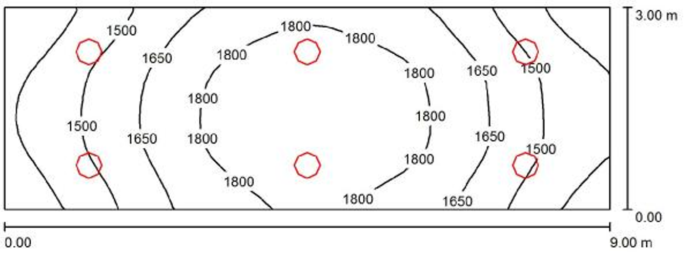Generally, plants consist of epiphytes, succulents, cacti and tropical spices. NOVETE® 120W G110 linear grow lights fitted with “T” mounting brackets were proposed and installed on the drop-down ceiling at distance of 2.1 meters from the green wall. The 6000K color temperature provides photon-base of 58.9 PAR watts or 268.4 µmol/s luminous efficacy. The radiant flux of the green wall is exhibited on left.